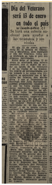 - 1937: Se instaura el DÍA DEL VETERANO de la Guerra del Pacífico en todo el país. Este día fue el inicio de querer darle un día a los guerreros chilenos de la Guerra del Pacífico. Para ello este día 13 de enero, aniversario de la Batalla de Chorrillos y Miraflores será instituido como el DÍA DEL VETERANO. Este día se efectuó una colecta nacional en todas las ciudades y pueblos de Chile, para ir en ayuda de los veteranos y las viudas de nuestros héroes. Un comité de personalidades que tomo a su cargo esta iniciativa, se entrevistó con el Ministro del Interior Don Matías Silva y con el Intendente de Santiago Don Julio Bustamante, quienes prometieron cooperar para su realización. El Ministro del Interior oficio inmediatamente a todos los gobernadores e intendentes del país, para que llevasen a cabo dicho aniversario. El día del Veterano fue oficializado con Decreto Ley, recién siete años después por el Presidente de Chile Juan Antonio Ríos. (Léase abajo 1944)