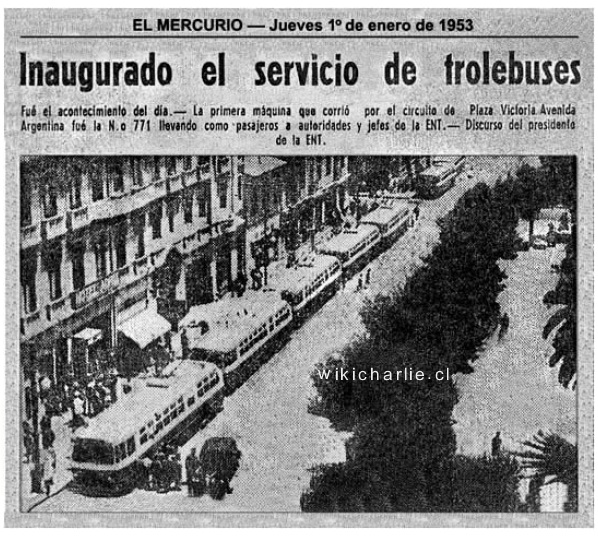 - 1953: Se inaugura en Valparaíso el servicio de Trolebuses. Este fue todo un acontecimiento. La primera máquina fue la N° 771, que corrió entre la Plaza Victoria y la Avenida Argentina. A bordo iban autoridades de la zona y ejecutivos de la Empresa Nacional de Trolebuses (ENT). Al inaugurar el Gerente de la ENT, realizo un discurso con referencia a la modernidad.