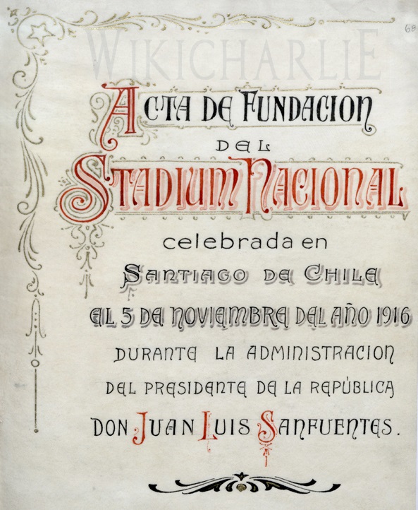 - 1916: Este dia se firma Acta de fundación del primer Estadio Nacional. El documento lleva la firma del Presidente de la República Don Juan Luís Sanfuentes, el presidente de la Corte Suprema, entre otras autoridades y benefactores de la iniciativa el 5 de noviembre de 1916.
