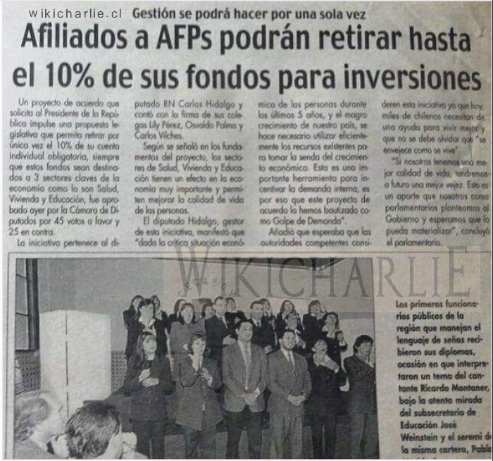 - 2002: RETIRO DEL 10% DE LOS FONDOS AFP: Articulo del 6 de septiembre de 2002, sobre el retiro del 10% de la AFP: Un proyecto de acuerdo que solicita el presidente de la república que impulse una nueva propuesta legislativa, que permita retirar por única vez el 10% de loa ahorros previsionales, siempre que estos sean destinados a tres sectores claves: Salud, vivienda y educación. E proyecto fue aprobado en la Cámara de Diputados por 45 votos a favor y 25 en contra. La iniciativa pertenece al diputado Carlos Hidalgo de Renovación Nacional, apoyado con la firma de Lily Pérez, Osvaldo Palma y Carlos Vilches. Según se señaló, el proyecto tiene la finalidad de mejorar la vida de las personas. El diputado Hidalgo gestor de la iniciativa manifesto: Está dada la situación económica de las personas durante los últimos 5 años y el magro crecimiento económico de nuestro país, se hace necesario usar eficientemente los recursos existentes, para tomar la senda del crecimiento económico. Esta es una importante herramienta para incentivar la demanda interna y es por eso que a este proyecto lo hemos bautizado como "Golpe de Demanda". Se espera que las autoridades competentes, consideren esta iniciativa, ya que hoy miles de chilenos necesitan de una ayuda para vivir mejor y no se debe olvidar "que se envejece, como se vive". Si nosotros tenemos una mejor calidad de vida, tendremos una mejor vejez. Esto es un aporte de nosotros como parlamentarios planteamos al gobierno y esperamos que se pueda materializa, concluyo. /[17]