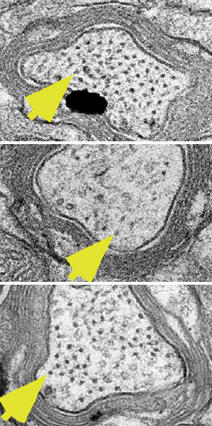 Las traumáticas lesiones cerebrales llevan a la alteración de las estructuras de andamiaje dentro de las neuronas (los puntos negros señalados por las flechas amarillas), como se observa en los cerebros de ratones lesionados que recibieron un placebo (la imagen central).