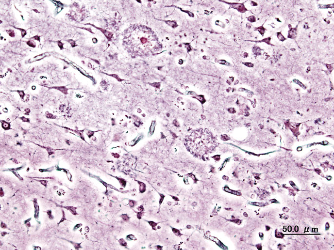 Las placas seniles tienen variedad de tamaño y forma, pero por lo general, son de aproximadamente 50 µm. Los polipéptidos de beta-amiloide tienden a conglomerarse y se cree que son neurotóxicos.[4] Un 10% de las personas mayores de 60 años tienen placas seniles y un 60% de la población mayores de 80 años, por lo que un número de estos puede deberse al proceso fisiológico de la vejez