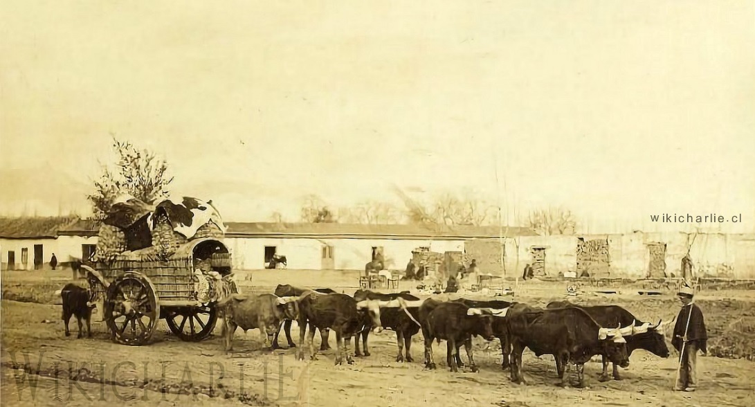 Imagen de una carreta chilena en Valparaíso, que transporta leña. Podemos apreciarla estructura baja hecha de troncos y la parte superior de coligues, de esta forma alivianaban el peso de la carreta y era muy resistente. El tapado de la madera está realizado con cuero. A la izquierda dos bueyes descansando y a la derecha los dos arrieros. Al medio una pequeña niña. El letrero atrás dice: Cañas de Guayaquil -Barraca Castro, por mayor y menor- pinos y otras maderas. //Fecha:1863. //Autor: Rafael Castro y Ordóñez. //Fuente: Comisión Científica del Pacífico.