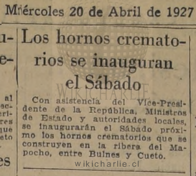 - 1909: Existía en Santiago un Cementerio Municipal llamado El Monte: El cementerio situado en la calle Pedro de Valdivia y a orillas del rió mapocho, quedo reducido después de la crecida que arraso con gran parte de este, ante tal situación la municipalidad resolvió habitar el antiguo cementerio, llamado "Cementerio de Coléricos" situado en la calle Aníbal Pinto. Este fue abierto nuevamente el día 5 de agosto de 1909, añadiéndose a lo ya existente, 90 mts. de largo y 67.5 de ancho, con un costo de habilitación de 3.375 pesos y 5 centavos.