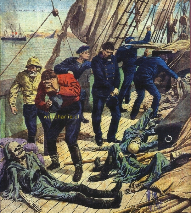 "Pisando con cautela la cubierta podrida, con grietas y partiduras en los lugares donde caminaban, encontraron tres esqueletos en la escotilla. En los comedores estaban los restos de diez cuerpos, y otros seis fueron encontrados; uno solo, posiblemente el capitán, en el puente. Había una quietud extraña alrededor, y un olor húmedo a moho que ponía la carne de gallina. Unos pocos restos de libros fueron descubiertos en el camarote del capitán, y un machete oxidado. Nada más extraño en la historia del mar se ha visto antes. El primer oficial examinó las ya débiles inscripciones en la proa y después de mucho pudo leer 'Marlborough, Glasgow'."