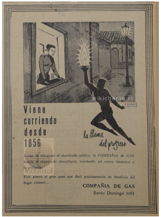 1857: El servicio de alumbrado a gas se inicia con la iluminación del Teatro Municipal de Santiago en su noche inaugural, el 17 de septiembre de 1857. La ceremonia, que contó con la asistencia del Presidente de la República, Manuel Montt, se inició con el Himno Nacional de Chile, seguido de una representación de la ópera “Hernaní” de Verdi. En los días siguientes la prensa destacó que una parte fundamental del espectáculo había sido la iluminación con gas hidrógeno, comentando que “opera una verdadera metamorfosis, parece que la noche fuese suplantada por el día, tanta es la claridad y pureza argentina de su luz, que forma con sus destellos un soberbio manto de plata en que envuelve a los espectadores”[1].