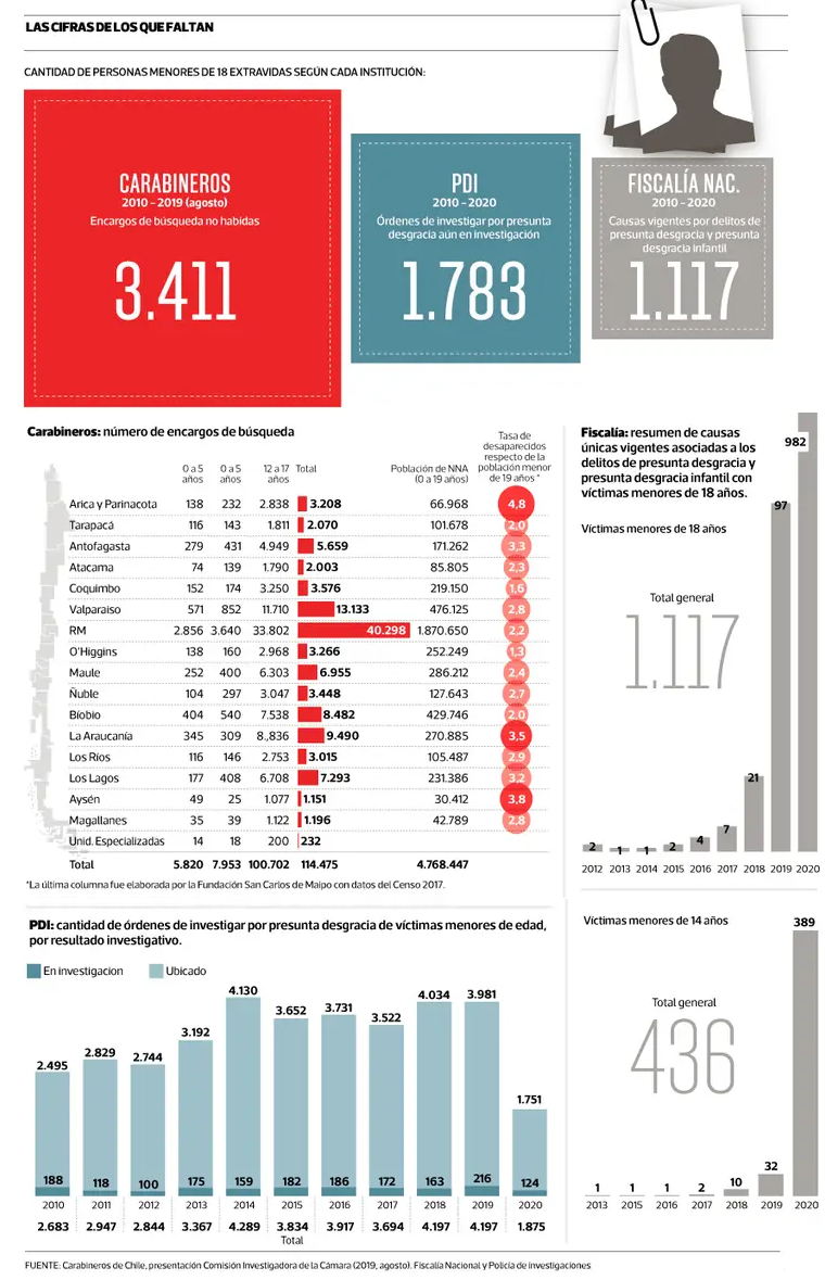 El catastro también trae la cuenta de los que todavía no han sido ubicados, aunque no existe una única cifra: según Carabineros, entre el 2010 y mitad de 2019 son 3.411 los encargos de búsqueda a menores de 18 sin resultado. La PDI dice otra cosa: en ese mismo periodo de años, sumando el 2020, las órdenes que aún permanecen en investigación en realidad son 1.783. Y la fiscalía arroja 1.117 causas de niños, niñas y adolescentes que siguen vigentes en los últimos 10 años[20].