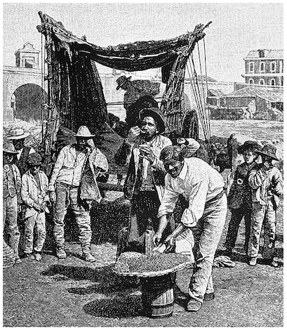 “En las ciudades, hombres y mujeres corren las calles con canastas llenas de este mote y una taza que llenan por uno o dos centavos. Como la harina tostada, es muy nutritivo y refrescante”.