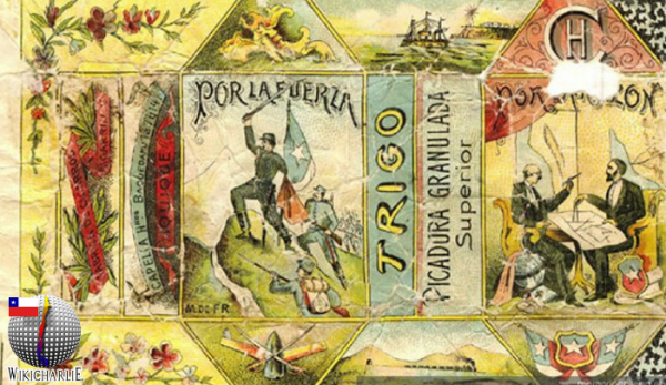 La imagen nos muestran la cajetilla usada en "Cigarrillos Por la Fuerza" en 1893. con gran popularidad entre el público chileno y sus patriotas. Fue fabricado por los italianos Capella Hermanos. En su cajetilla destacaban varios hechos históricos de la Guerra del Pacífico, como la figura de Manuel Baquedano, con su espada desenvainada, el Combate Naval de Iquique, destacado el año 1879 y a la derecha ministros chilenos con mapas de guerra. Léase: Historia del cigarrillo en Chile