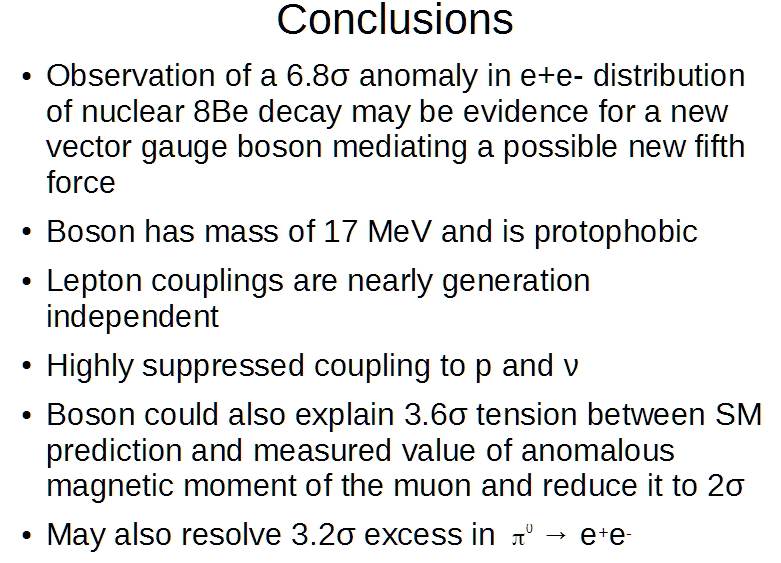 Según han explicado los autores físicos teóricos de la Universidad de California en Irvine (UCI), en el artículo, publicado en 'Physical Review Letters', se trata de un hallazgo "revolucionario" porque una quinta fuerza podría "cambiar completamente la comprensión del Universo", con consecuencias para "la unificación de las fuerzas y la materia oscura", según un estudio de la Academia de Ciencias de Hungría del pasado año 2015 y un estudio más reciente de un equipo de EE.UU, publicado en arXiv[1]. Dicha fuerza de la naturaleza se uniría, en tal caso, a las cuatro ya conocidas: Gravedad, Electromagnetismo, Fuerza Nuclear Fuerte y Fuerza Nuclear Débil.
