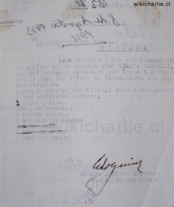 Para remitir a ese establecimiento el cadáver de Juan Ivanni Sambelli, que fue ordenado de levantar por orden telefónica del Sr. Juez del Crimen de Turno. Lleva las siguientes especies: